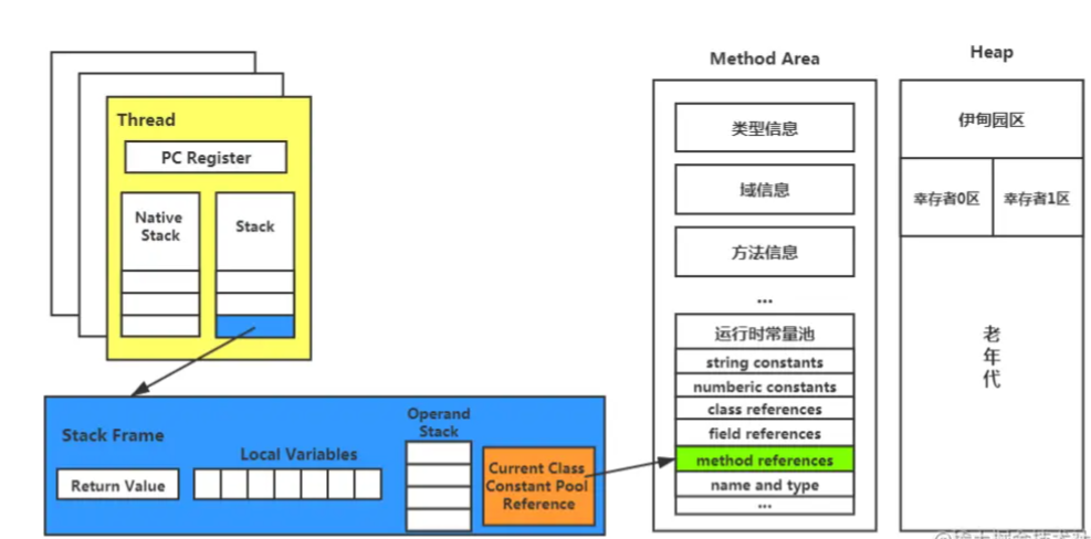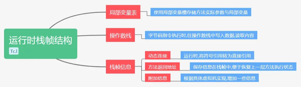 每个栈帧中包括: 局部变量表,操作数栈,栈帧信息(返回地址,动态连接,附加信息)