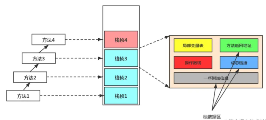 线程私有的栈服务于方法,每个方法代表一个栈帧,方法的调用与调用结束标志着栈帧的入栈与出栈,栈帧中的局部变量表、操作数栈、方法返回地址、动态连接(运行时常量池引用)、附加信息是为了帮助更好的服务方法,栈;hospot虚拟机中栈可能存在栈溢出异常(递归调用无终止条件),也可能存在内存溢出异常(当创建线程无法分配内存时)