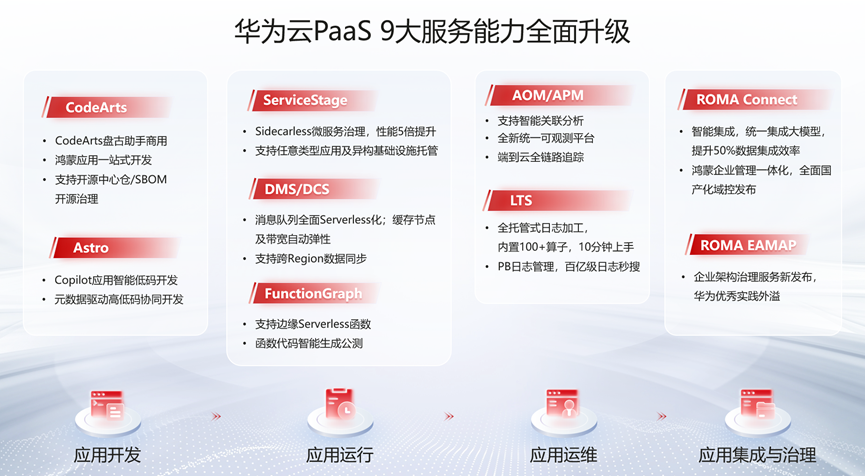 此次论坛上,华为云发布了PaaS 9大服务能力的全面升级,涵盖应用开发、运行、运维、集成与治理四大领域。