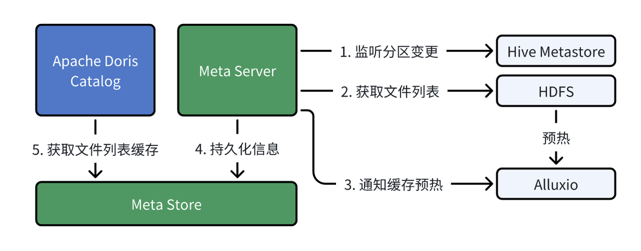 通过 Meta Server 服务,实现了查询引擎(Doris)、元数据服务(Hive Metastore)、数据缓存服务(Alluxio) 三方联动,在提供高效的元数据访问的同时,也提升了数据缓存的时效性。