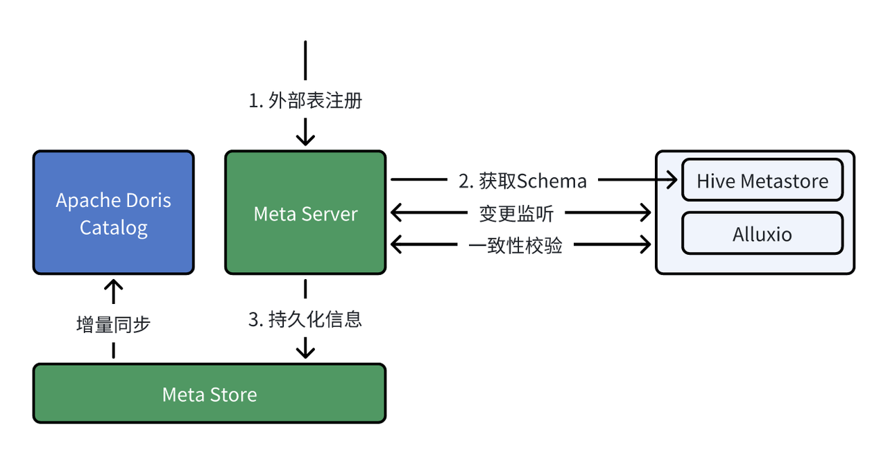 如上图所示,Meta Server 负责监听其他服务中的元数据变化,如 Hive Metastore 中的 Schema 变化,Alluxio 中的缓存变化等,并将这些信息持久化到后端的 Meta Store 中。同时,Meta Server 会将元数据定期的推送给 Doris FE 的 Catalog 中,并通过元数据校验服务来保证两边数据得一致性。