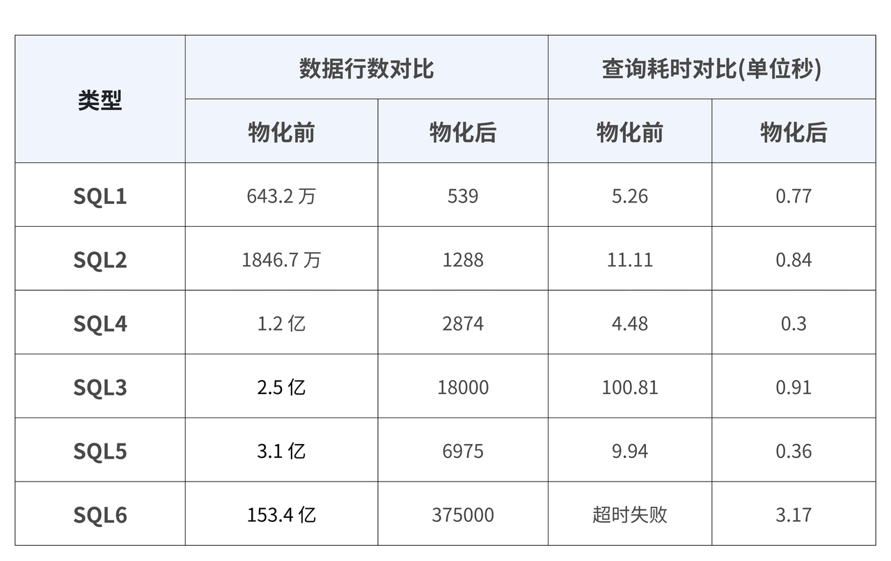 上图直观展示“数据行数”和“查询耗时”这两个维度在物化前后的对比。百万到百亿级别的数据经过物化处理后,行数压缩至少达 11 倍。在查询耗时方面,针对百亿级别以下的数据,物化后均可实现毫秒级响应,查询性能相比物化前提升至少 6 倍。