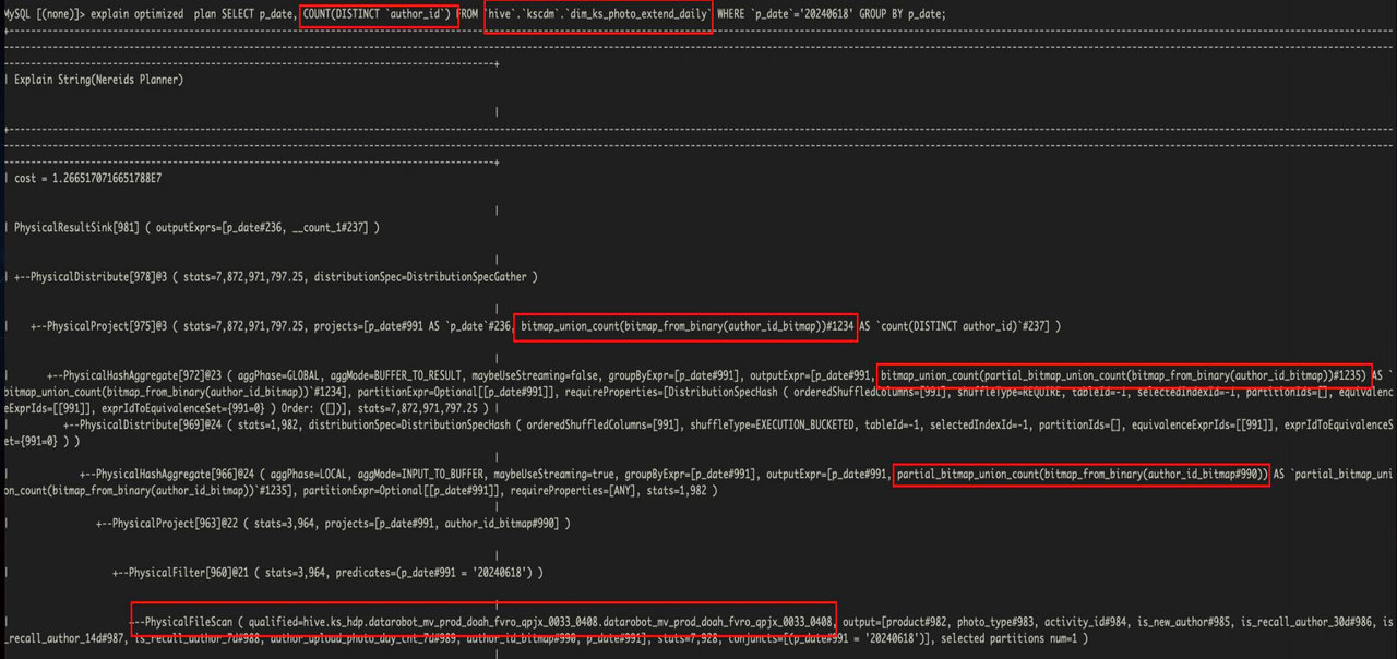 如下是对 author_id指标进行去重的外表查询的改写结果示例。可以看到 Doris 将 count distinct算子改写为了更高效的 Bitmap 算子,并将目的表改写到了合适的物化视图表上。