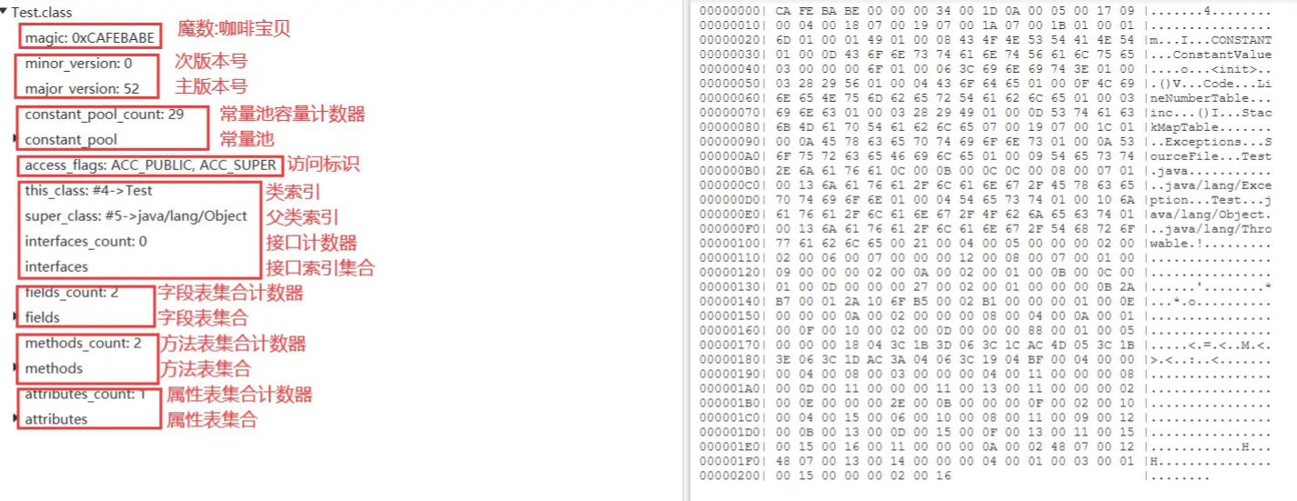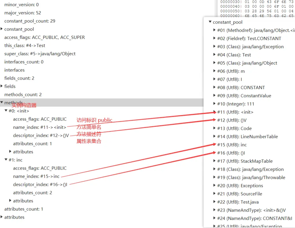 | u2 | methods_count | 1 | 方法表集合计数器 | 统计类的方法数量 |