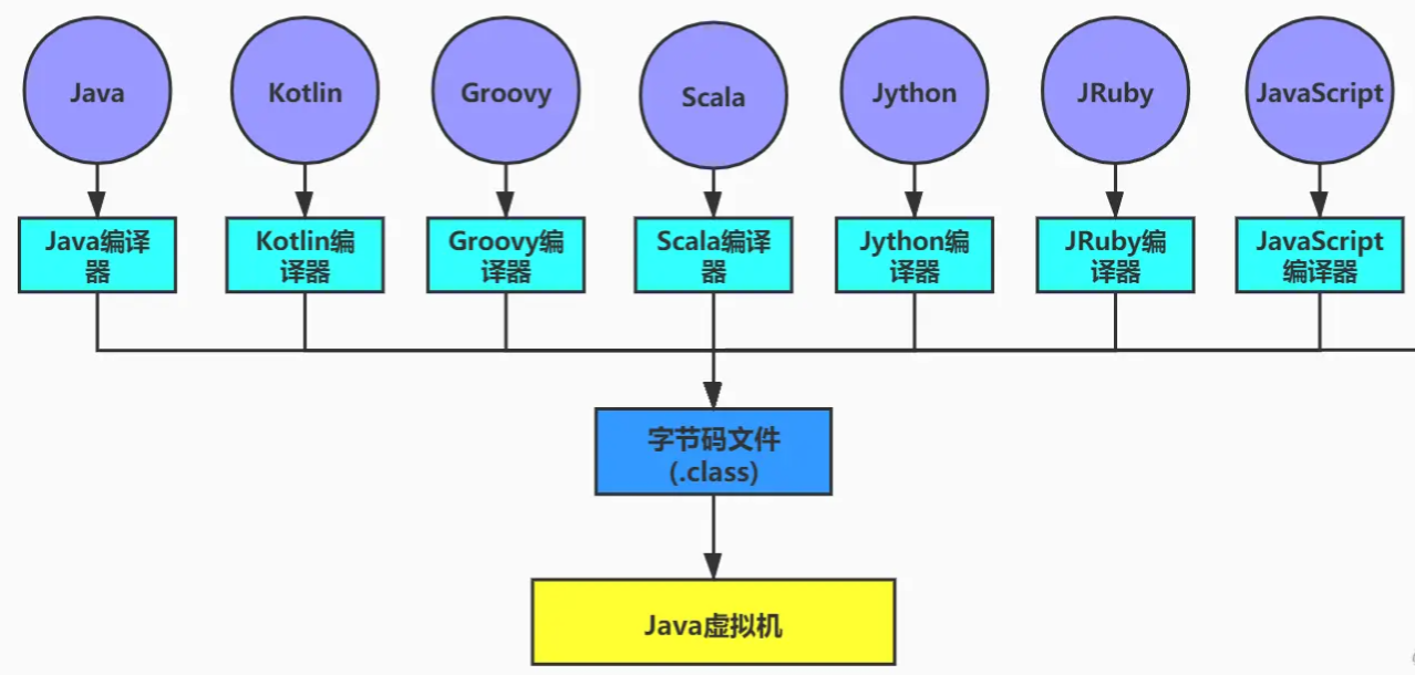 Java文件编译成字节码文件后,通过类加载机制到Java虚拟机中,Java虚拟机能够执行所有符合要求的字节码,因此无论什么语言,只要能够编译成符合要求的字节码文件就能够被Java虚拟机执行