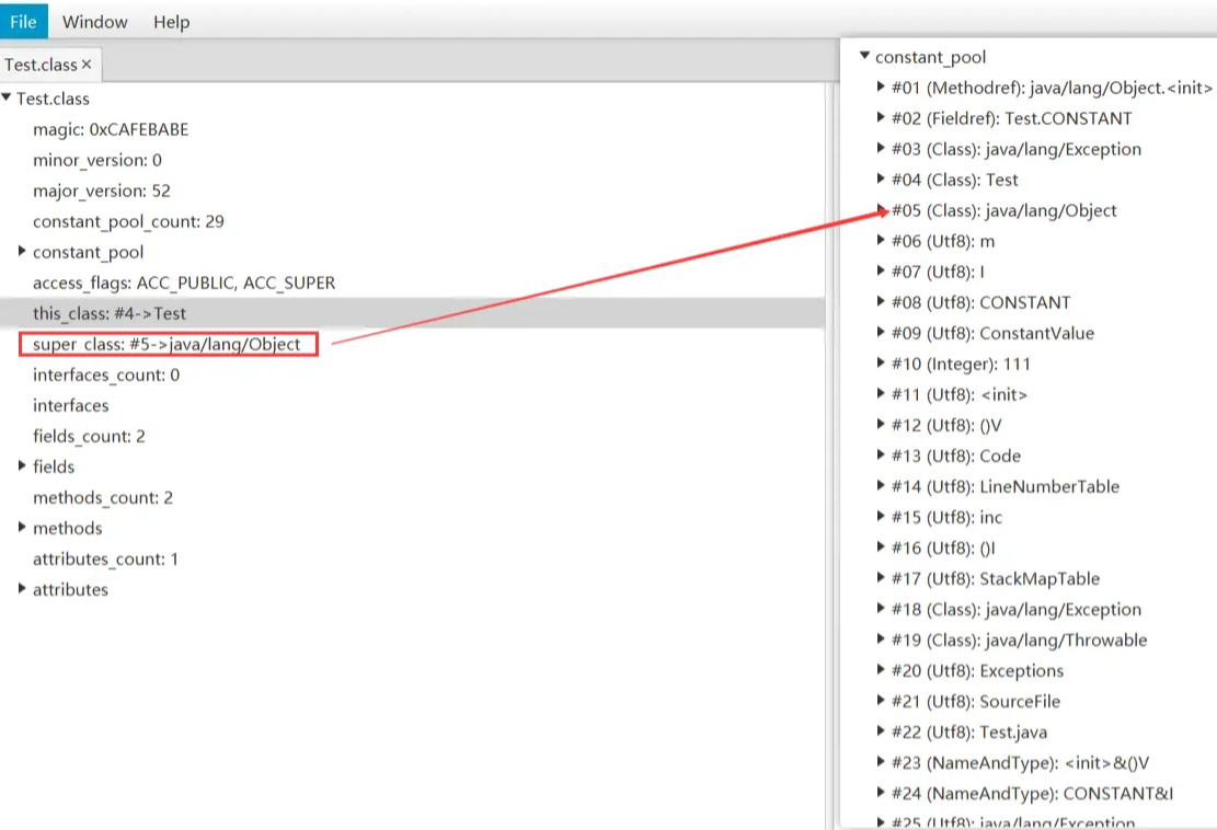 | u2 | super_class | 1 | 父类索引 | 确定父类的全限定名 |