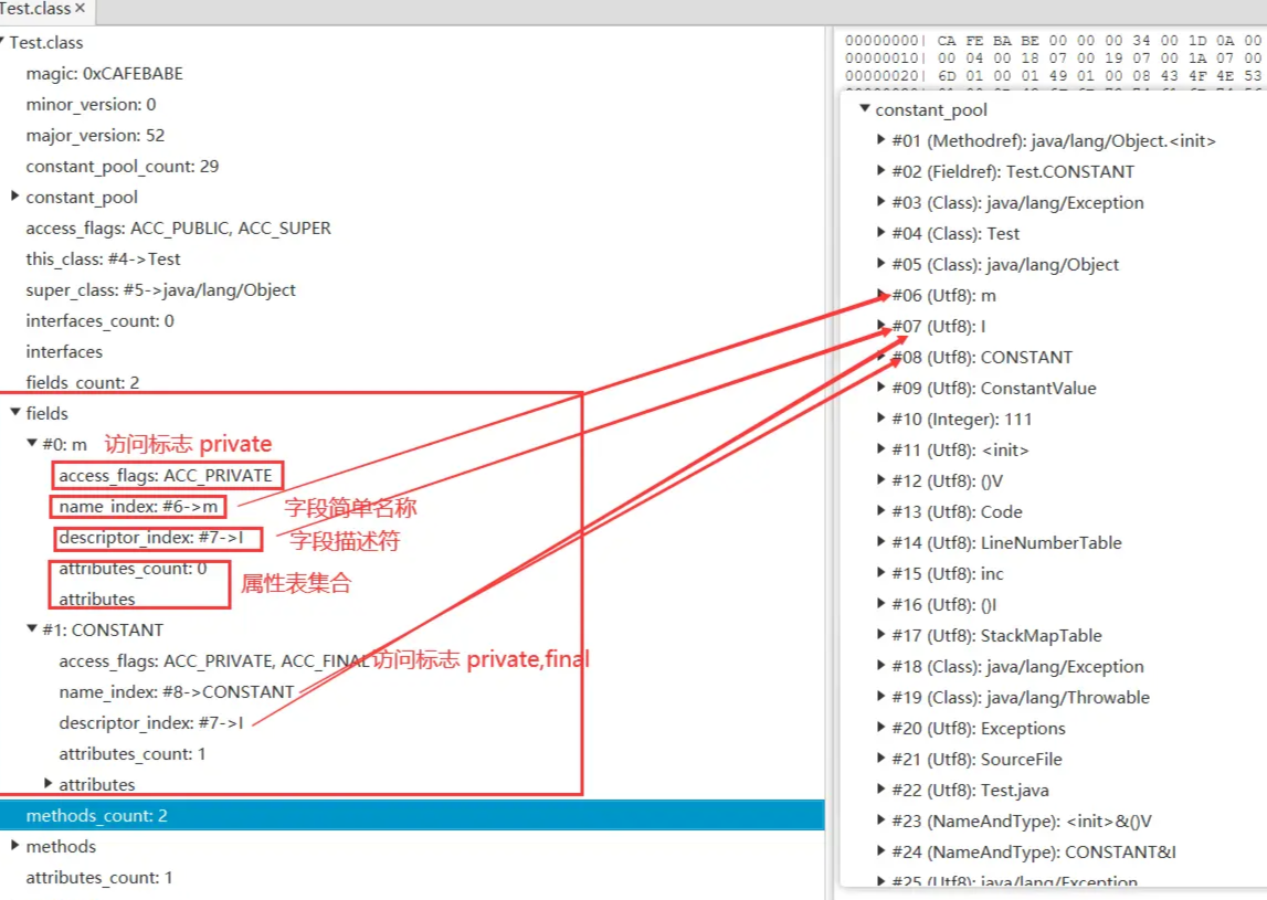 | u2 | attribute_count | 1 | 属性表集合计数器 | 统计属性数量 |