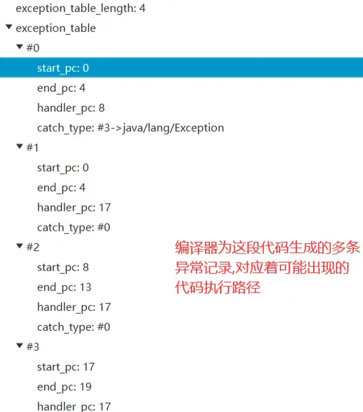 其中的异常表集合代表 编译器为这段代码生成的多条异常记录,对应着可能出现的代码执行路径
