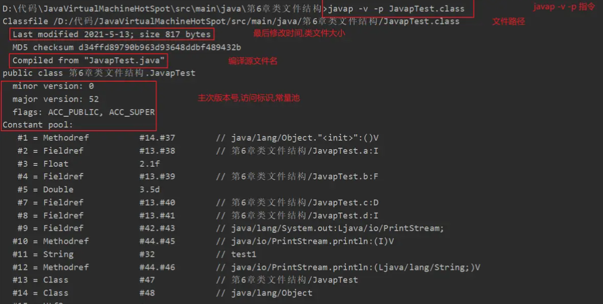 javap -v 基本上可以反汇编出Class文件中的很多信息(常量池,字段集合,方法集合…)