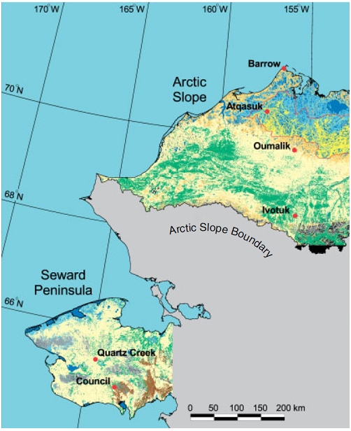 Arctic Vegetation Plots ATLAS Project是一个涵盖阿拉斯加北斯洛普和西北角(Seward Peninsula)地区的研究项目,该项目旨在收集和描述该地区的植被数据。数据收集时间为1998年至2000年。