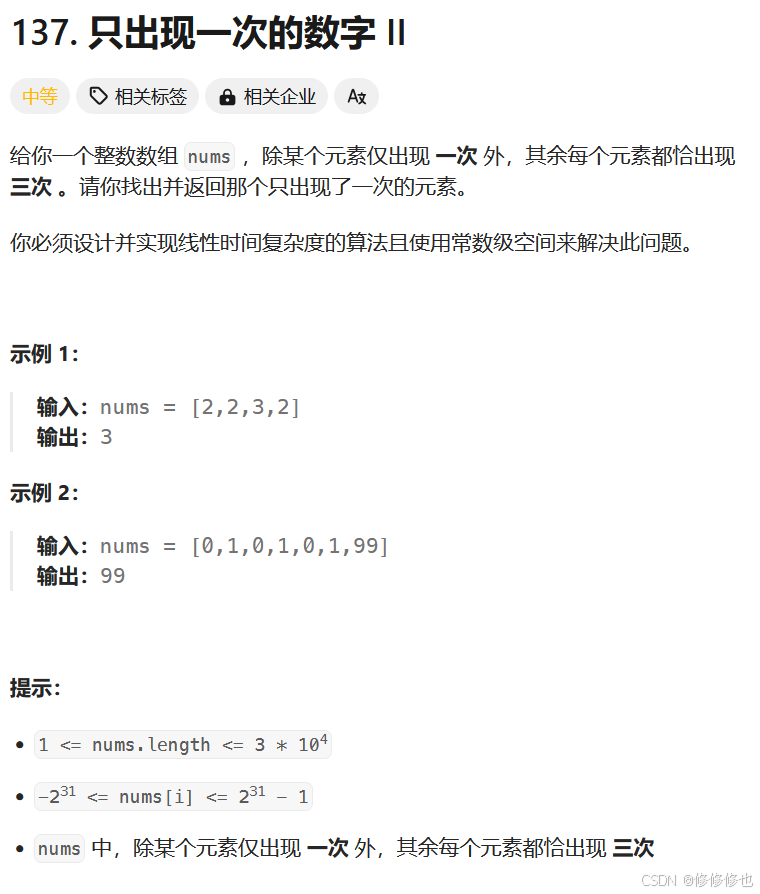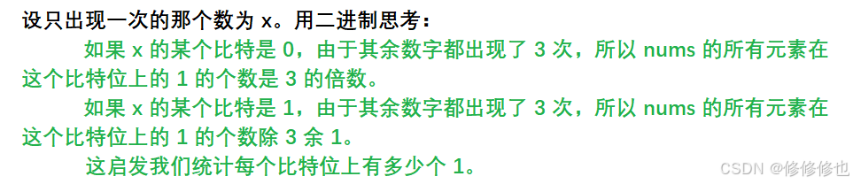 给你一个整数数组 nums ,除某个元素仅出现 一次 外,其余每个元素都恰出现 三次 。请你找出并返回那个只出现了一次的元素。