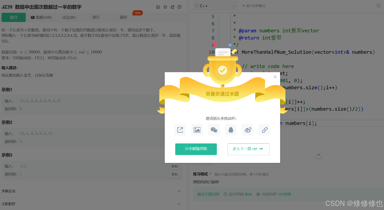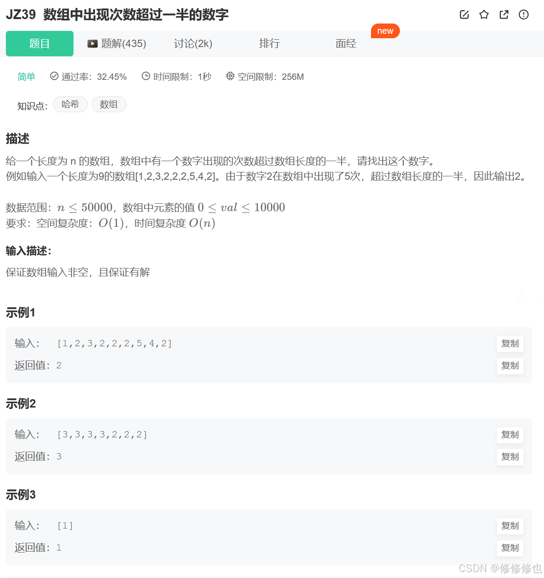 JZ39 数 组 中出 现 次数超 过 一半的数字