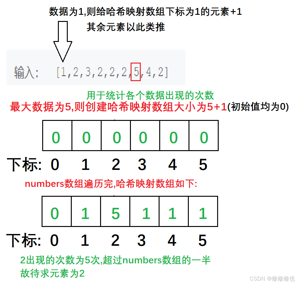 利用哈希的思想,创建一个数据范围内大小的vector,用于统计各个数据出现的次数.然后遍历数组numbers,每遍历一个数据就给其对应哈希映射的对应数据+1,然后判断其映射数据是否大于numbers数组长度的一半,如果大于,则该数据即为待求数据.解题过程图示如下: