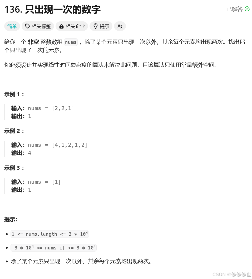 给你一个 非空 整数数组 nums ,除了某个元素只出现一次以外,其余每个元素均出现两次。找出那个只出现了一次的元素。