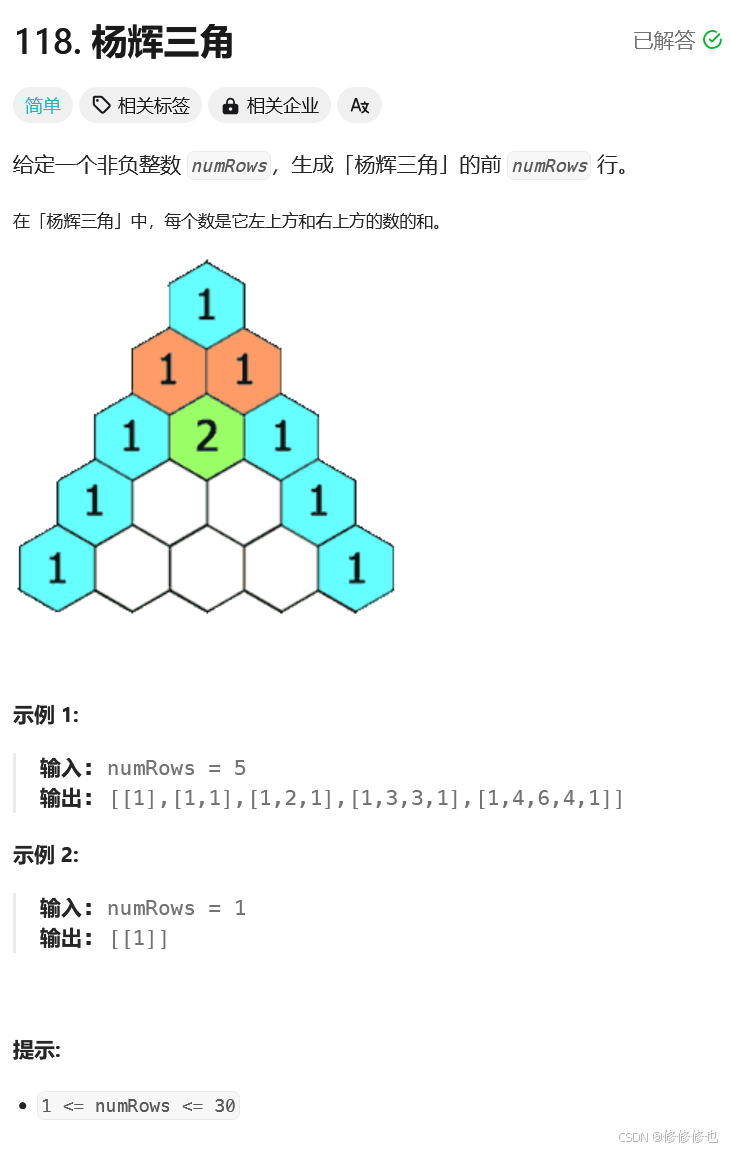 给定一个非负整数 numRows,生成「杨辉三角」的前 numRows 行。