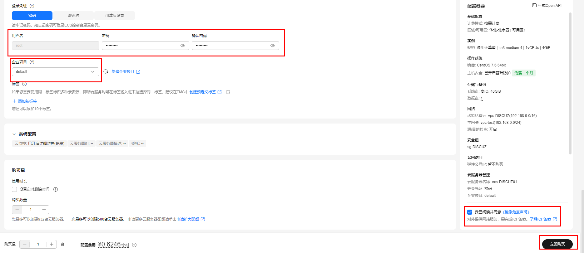 配置完后点击立即购买即完成ecs-DISCUZ02资源的购买。