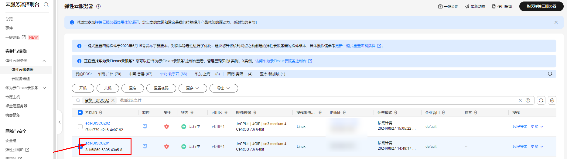 (2) 控制台输入“弹性云服务器 ECS”跳转弹性云服务器列表,然后登录部署网站的ecs-DISCUZ02机器上。