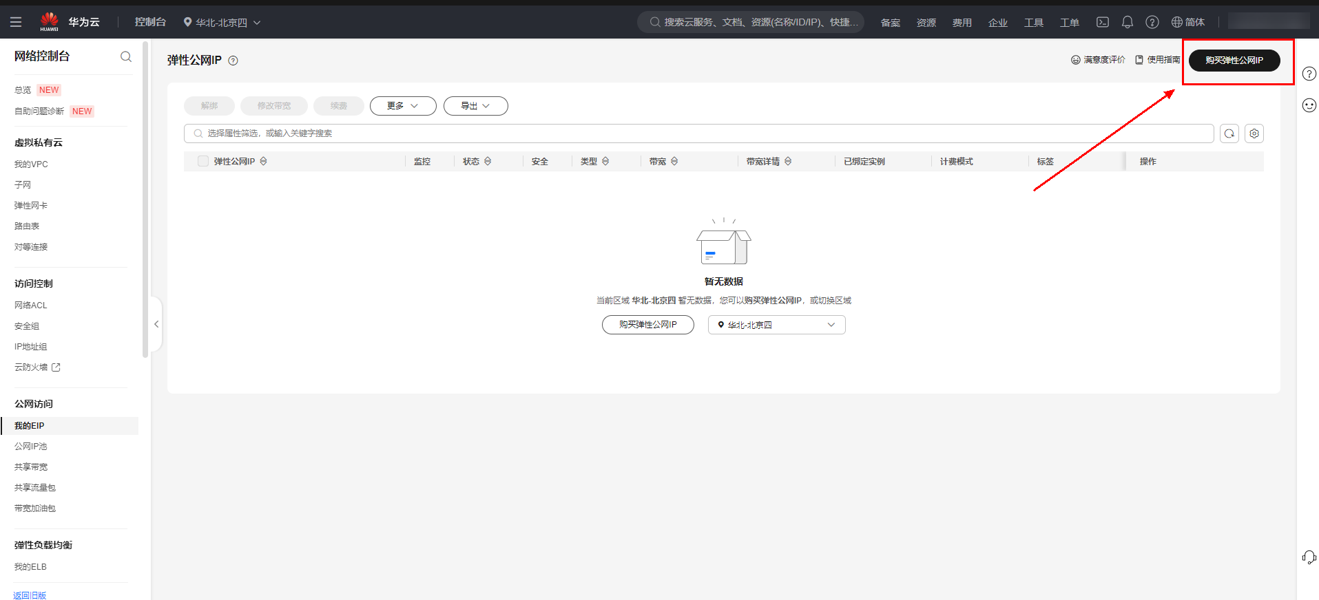 点击右上角的“购买弹性公网IP”按钮,进行弹性公网IP的购买。