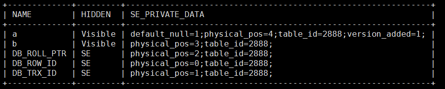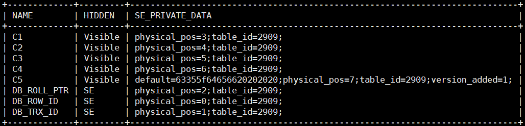 新建表列元数据如上图所示,HIDDEN列表示可见性。三个系统列的可见性为SE,代表INNODB可见,SERVER层不可见。SE_PRIVATE_DATA中也只记录着table_id。