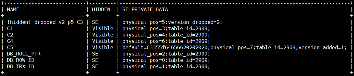 列元数据中C3列的名字已经修改为了 '!hidden!_dropped_v2_p5_C3'。v2代表在表version为2的时候删除的,p5表示此列的physical_pos为5。
