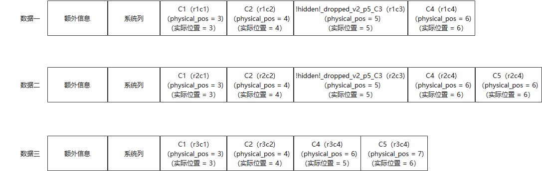 那是因为部分record(数据一、数据二)中还有此列数据,解析record时需要所有列元数据,所以C3列的元数据需要保留。而关于改名成 '!hidden!_dropped_v2_p5_C3',是因为C3列在逻辑上被删除了,后续若添加同名列(重新添加C3列),那么应该要添加成功。于是就换成由删除版本信息以及当前物理位置信息共同构成的一个名字。