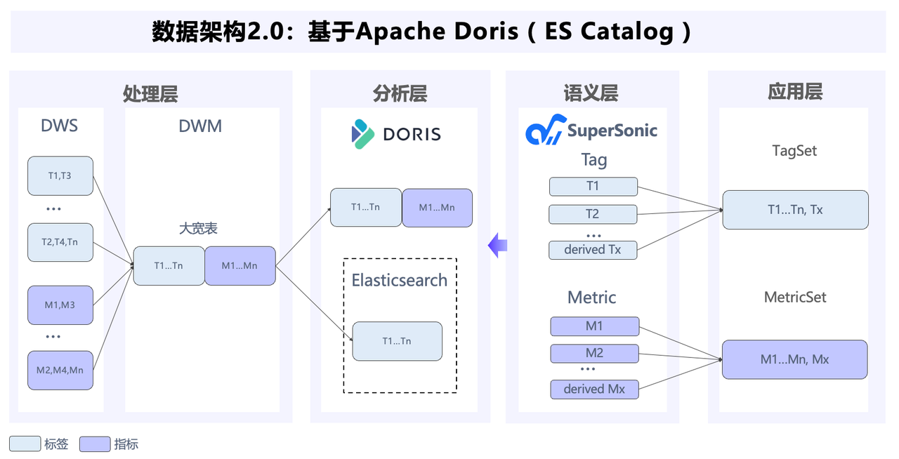 因此,腾讯音乐将 Doris 升级至 2.0 版,将架构从原先的 Elasticsearch 和 Doris 转变为统一的 Doris 解决方案: