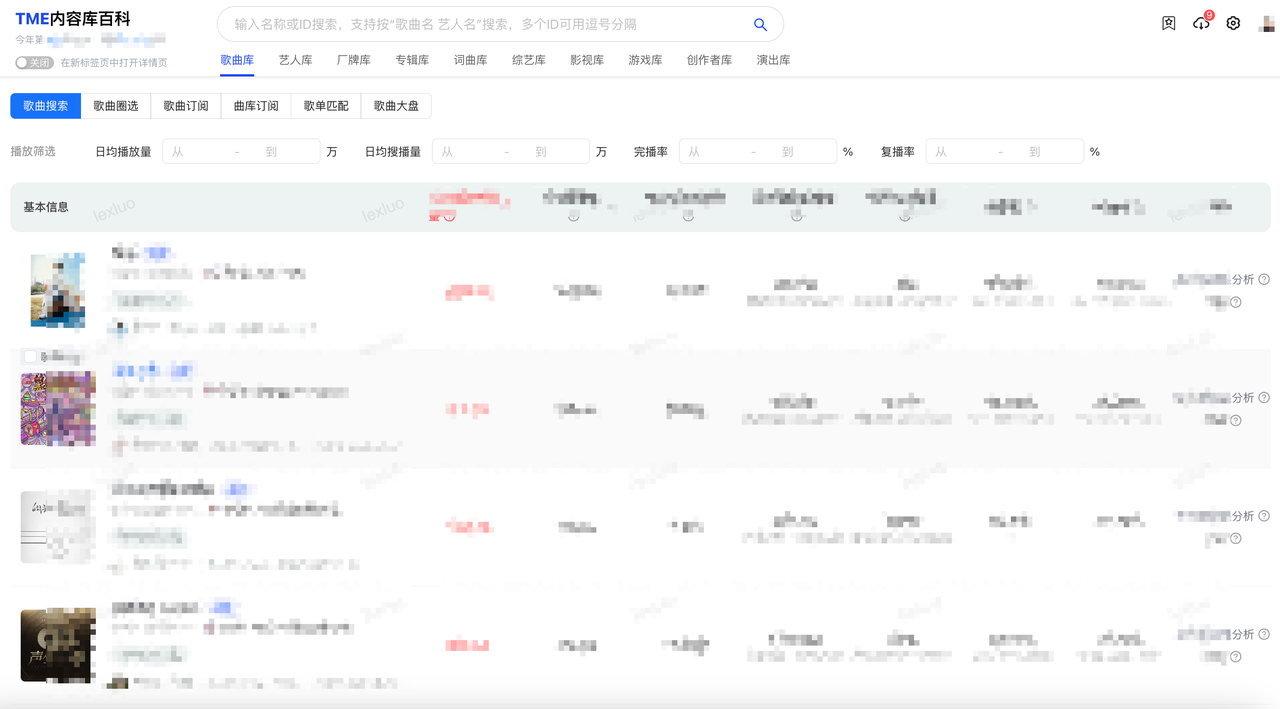 - 内容库百科搜索: 分析师和运营人员需要快速查找歌手、歌曲名称以及其他文本信息。这种检索能力不仅要求高效的全文搜索,还需支持多种查询条件,以便用户能够迅速获取所需数据,提升工作效率。