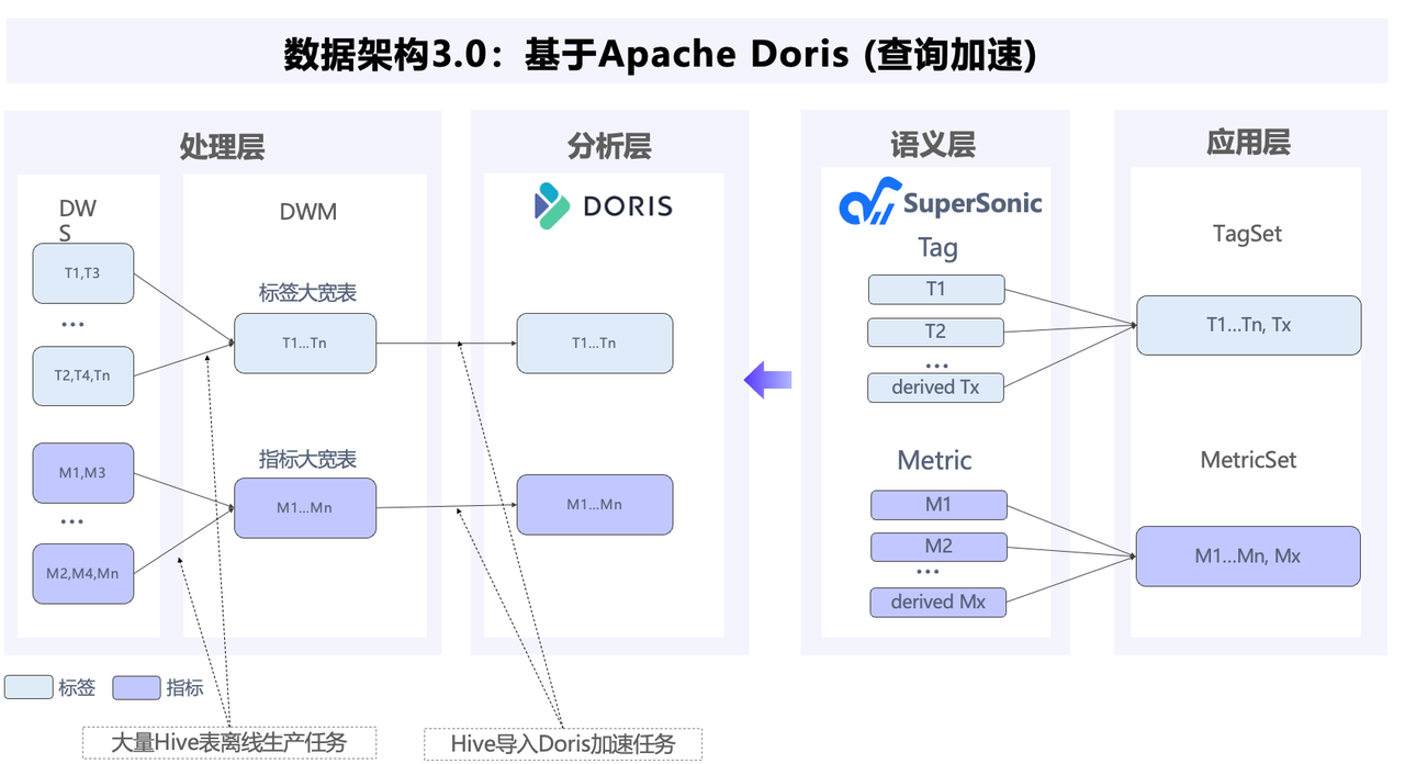 - 维度表:使用 Merge-on-Write Unique 模型,用于百科搜索和标签圈选,通过部分列更新进行维度更新。