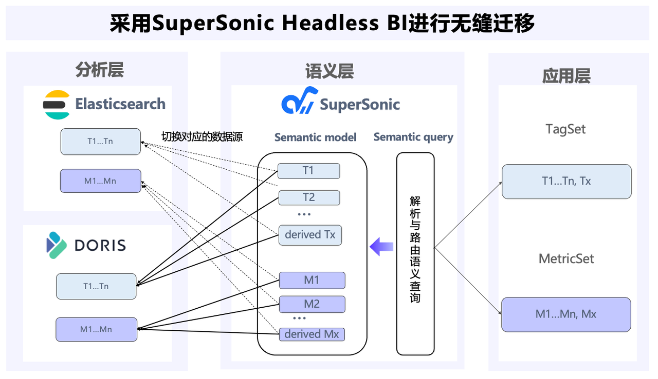 在业务迁移过程中,业务团队通过 SuperSonic Headless BI 进行。利用转换工具将 DSL 转换为 Elasticsearch SQL 查询,只需切换已定义指标和标签所对应的数据源即可。由于 Headless BI 屏蔽了底层不同数据存储和分析引擎的差异,业务方能够实现无感知的迁移。