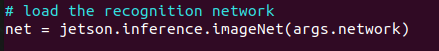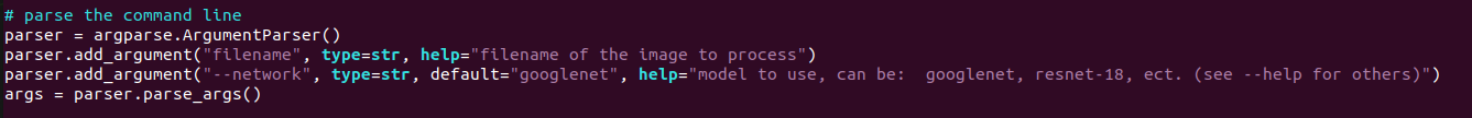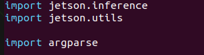 接下来,我们将导入要在脚本中使用的 Python 模块。新增 import 语句,用于加载 jetson.inference 和 jetson.utils 模块,用于识别图像和加载图像。我们还将加载用于解析命令行的标准 argparse 包。