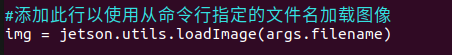 添加以下行以使用从命令行指定的文件名加载图像:(返回的图像将是一个 jetson.utils.cudaImage 对象,其中包含 width、height 和像素格式等属性:)
