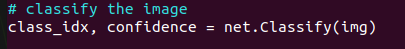 接下来,将使用 imageNet.Classify() 函数通过识别网络对图像进行分类:(imageNet.Classify() 接受图像及其尺寸,并使用 TensorRT 执行推理。)