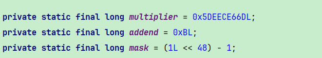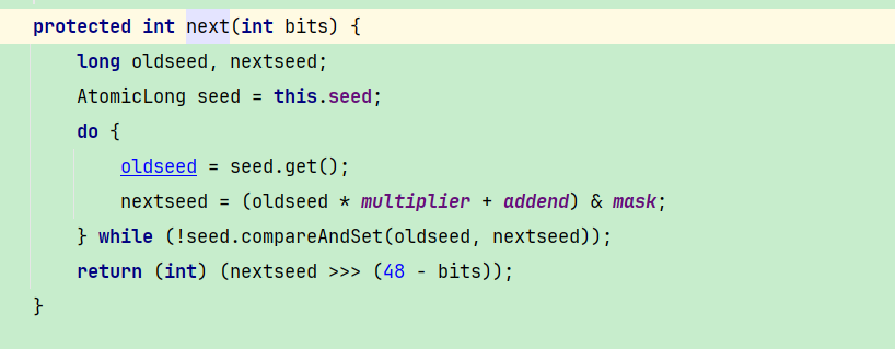 random类两个重要的函数,先看nextInt()。进入后,核心代码就是如下,逻辑也很简单,就是根据旧种子经过一系列运算后,得到新种子,然后进行位运算得到下一个值。其中的几个参与计算的值也是固定值。