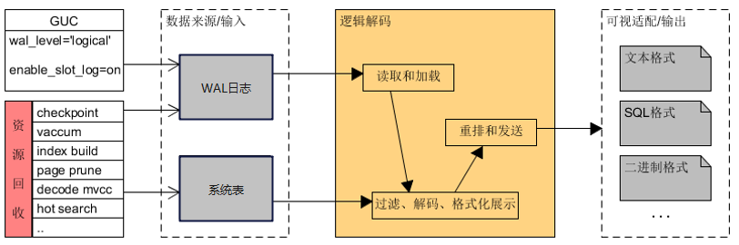 逻辑解码用于将WAL日志解析为易于理解和处理的逻辑日志格式,包括JSON、二进制或者固定的text格式。用户和逻辑复制工具(如DRS)可以根据自身需求来解析和处理这些逻辑日志。