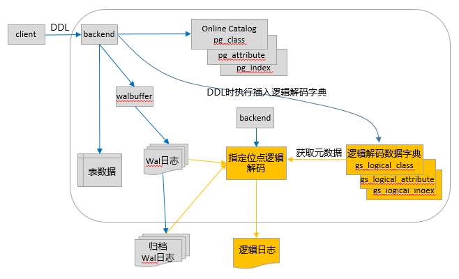新安装的实例会自动创建好逻辑解码多版本数据字典,非新安装的实例,首次初始化逻辑解码多版本数据字典时,需要调用一个系统函数进行初始化,该系统函数将内核系统表的数据同步到逻辑解码多版本数据字典中。当DDL语句执行完,事务提交前,往内核系统表插入元数据的同时往逻辑解码多版本数据字典插入元数据。解码的时候,解码线程根据当前csn快照,从逻辑解码多版本数据字典中将元数据信息读取到localcache缓存中使用。同时逻辑解码实现了多版本数据字典清理的定时任务,通过guc参数,配置保留时间,将超过保留时间的元组删除。而且,通过该guc参数,我们可以保留任意时间的旧元组,从而在不影响数据库性能的基础上实现从指定位点(即WAL的物理位置)进行逻辑解码,位点可以是包括归档WAL日志在内的任意位置。