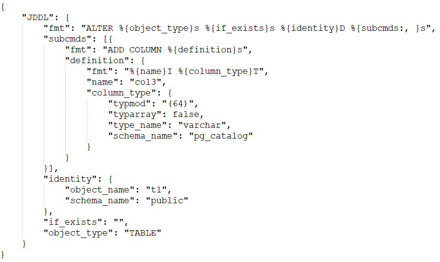 GaussDB逻辑解码支持DDL解码。如果GaussDB开启了逻辑解码,则会在DDL SQL执行阶段对DDL语句的解析树进行解析,解析的结果组装为Json格式的字符串(示例),并新增一种WAL日志类型,用于将该Json字符串写入WAL日志。逻辑解码线程解析到该WAL日志类型时,按照原Json格式输出DDL的解码逻辑日志。DDL语句alter table t1 add column col3 varchar(64)的Json格式解码结果如下图所示。