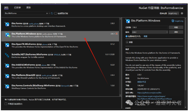 在Nuget包管理器中搜索:Eto.WinForms进行安装: