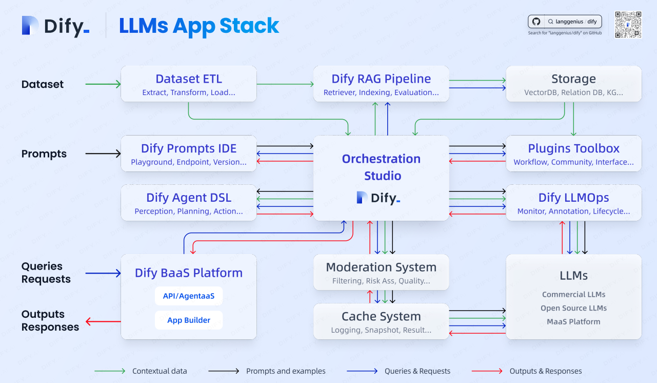 - 模块化设计:Dify采用模块化的设计,每个模块都有清晰的功能和接口。开发者可以根据需求选择性地使用这些模块来构建自己的AI应用,从而实现快速迭代和优化。