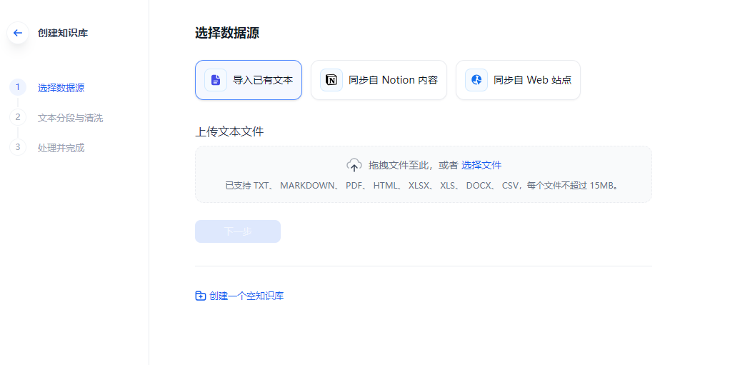 - 如果还没有准备好文档,可以先创建一个空知识库;