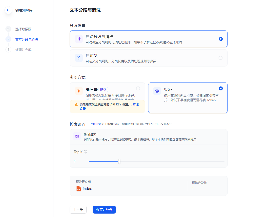 5. 完成上传:配置完上文所述的各项配置后,轻点“保存并处理”即可完成知识库的创建。