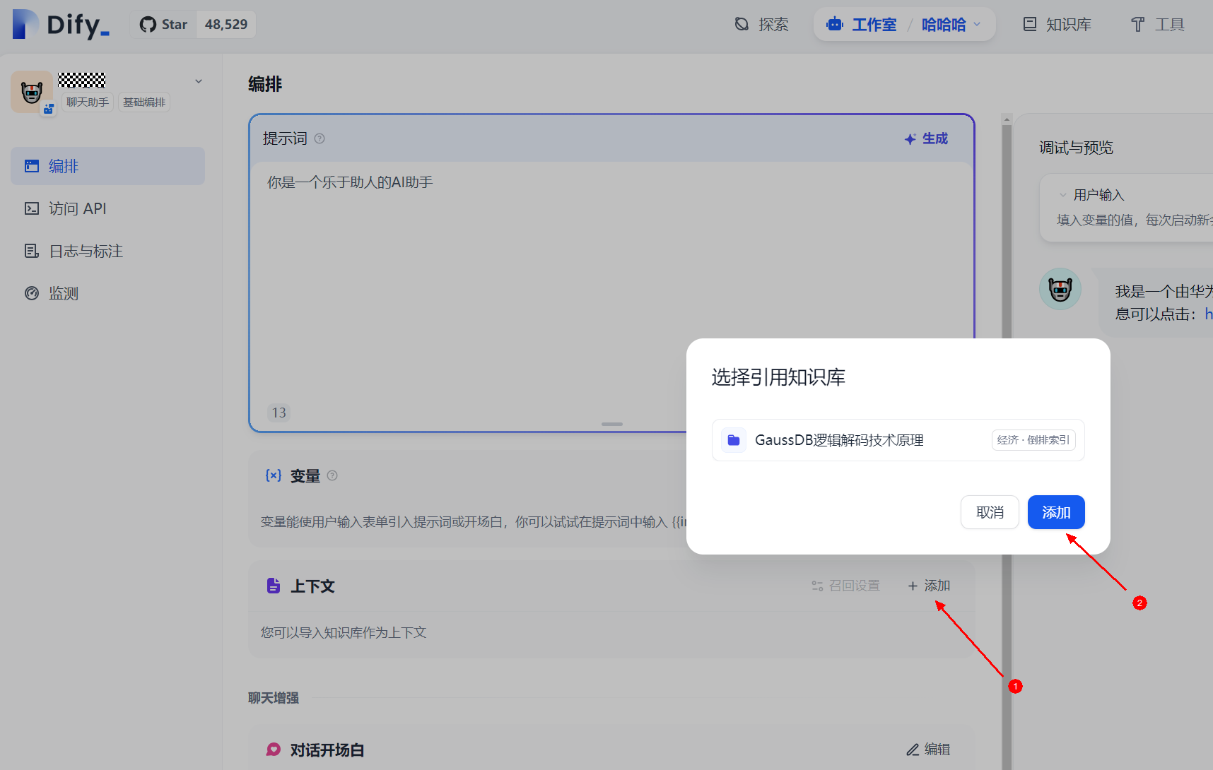 6. 在应用内集成知识库:如果想要让 AI 的对话范围局限在知识库内,例如企业内的客服话术规范,可以在“上下文”内引用知识库。