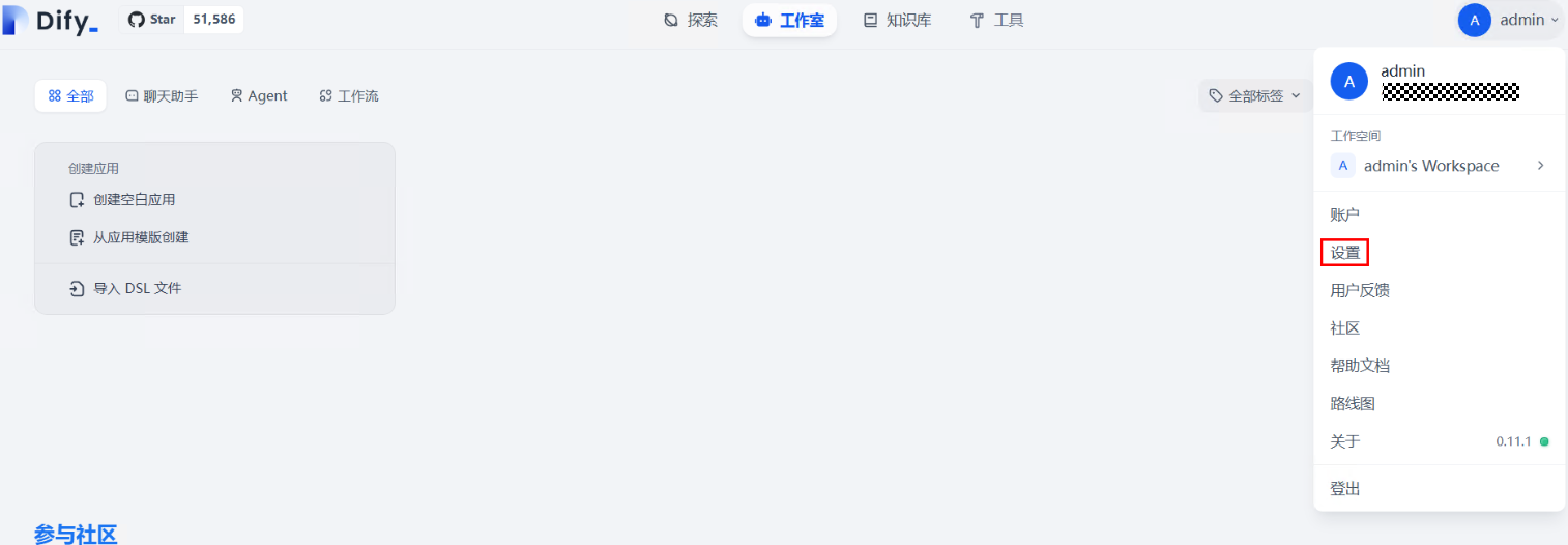 下面我们就进入实践操作步骤,首先浏览器进入您部署的Dify平台界面,如果您想快速部署开箱即用的Dify LLM应用开发平台,可参考:快速搭建Dify LLM应用开发平台。