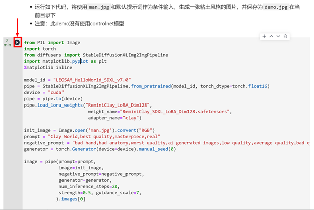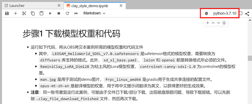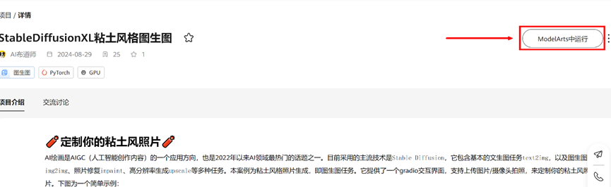 打开StableDiffusionXL粘土风格图生图案例,网址如下:https://pangu.huaweicloud.cn/gallery/asset-detail.html?id=f35e04de-997a-43dc-81ff-4c8219318b60,点击页面右侧按钮ModelArts中运行,进入开发环境。