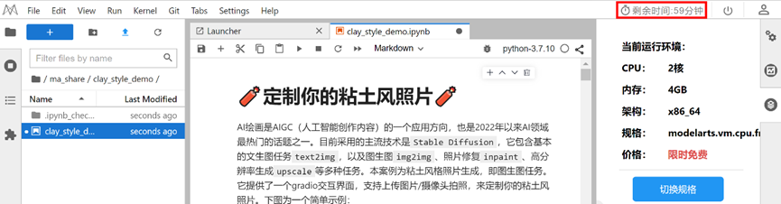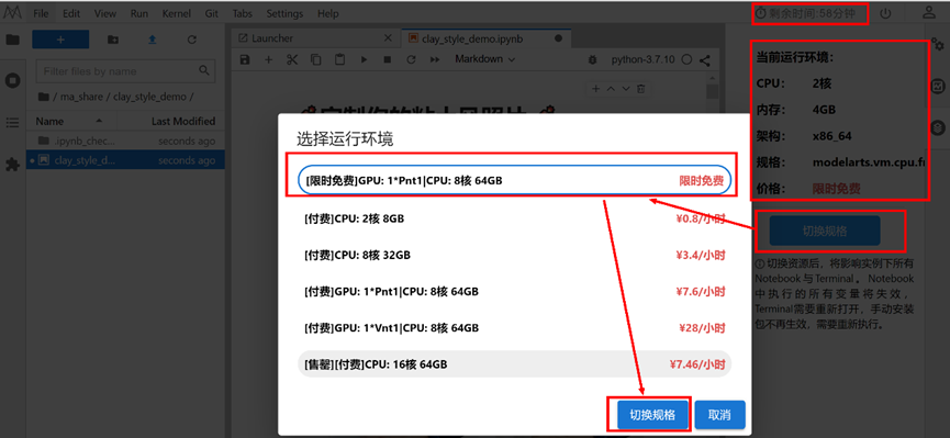进入notebook页面,默认是CPU规格资源,需要手动将资源切换为【限时免费】的GPU规格资源