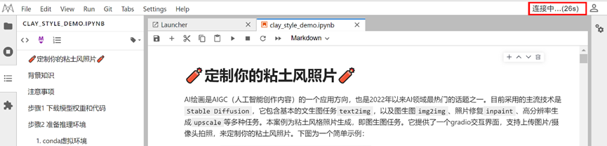 跳转到Notebook开发环境,需要等待一会儿,如果出现弹窗点击确定,等待右上角连接中倒计时结束并初始化完成,提示剩余时间即可。