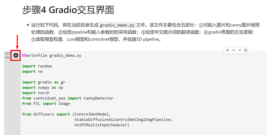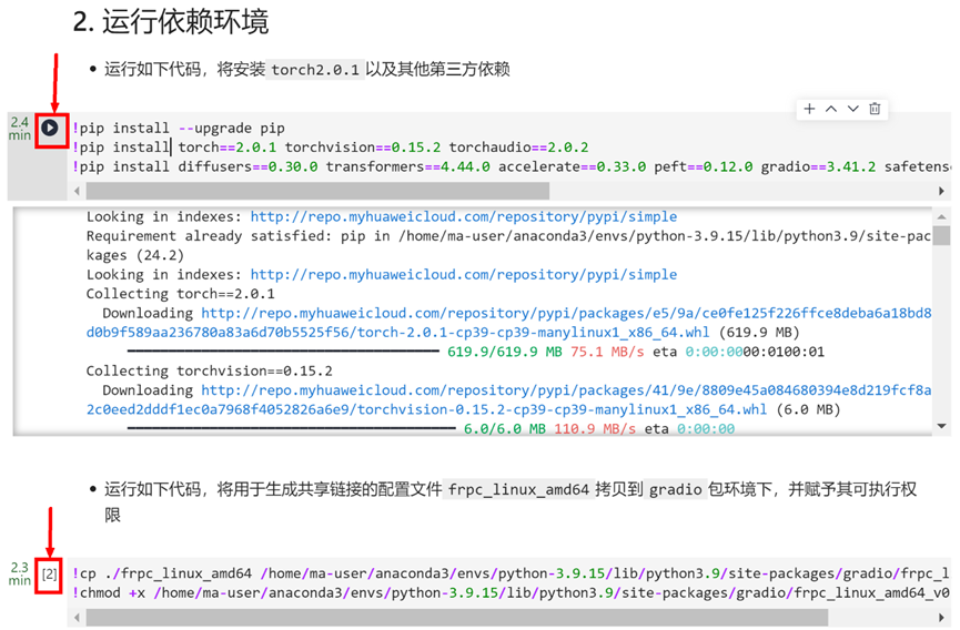再依次运行步骤1、步骤2的每个cell,点击每处代码左侧三角形逐个运行即可。