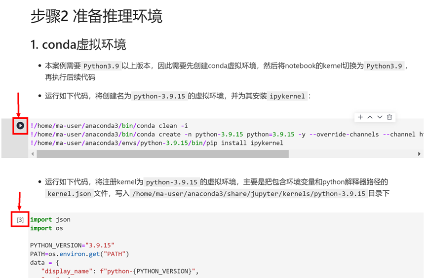 python-3.9.15的虚拟环境,并为其安装ipykernel:!/home/ma-user/anaconda3/bin/conda clean -i !/home/ma-user/anaconda3/bin/conda create -n python-3.9.15 python=3.9.15 -y --override-channels --channel https://mirrors.tuna.tsinghua.edu.cn/anaconda/pkgs/main !/home/ma-user/anaconda3/envs/python-3.9.15/bin/pip install ipykernelimport json import os PYTHON_VERSION="3.9.15" PATH=os.environ.get("PATH") data = { "display_name": f"python-{PYTHON_VERSION}", "env": { "PATH": f"/home/ma-user/anaconda3/envs/python-{PYTHON_VERSION}/bin:/home/ma-user/anaconda3/envs/python-3.7.10/bin:/home/ma-user/anaconda3/envs/PyTorch-1.8/bin:/usr/local/openmpi/bin:/usr/local/nvidia/bin:/usr/local/cuda/bin:/usr/local/sbin:/usr/local/bin:/usr/sbin:/usr/bin:/sbin:/bin:/modelarts/authoring/notebook-conda/bin:/home/ma-user/modelarts-dev/ma-cli/bin:/modelarts/authoring/script/entrypoint/deps/ssh/bin" }, "language": "python", "argv": [ f"/home/ma-user/anaconda3/envs/python-{PYTHON_VERSION}/bin/python", "-m", "ipykernel", "-f", "{connection_file}" ] } jupyter_kernel_dir = f"/home/ma-user/anaconda3/share/jupyter/kernels/python-{PYTHON_VERSION}" if not os.path.exists(jupyter_kernel_dir): os.mkdir(jupyter_kernel_dir) with open(os.path.join(jupyter_kernel_dir, "kernel.json"), "w") as f: json.dump(data, f, indent=4)