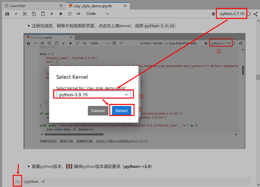 完成上述步骤后,稍等片刻,或刷新页面,点击右上角kernel选择python-3.9.15(有时候会出现在左上角,同样操作即可)。