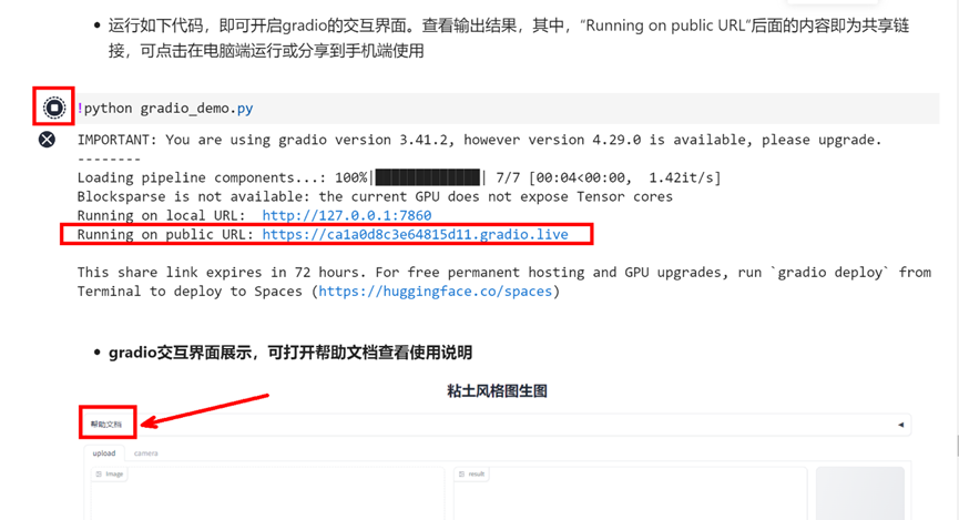 接着继续往下运行,点击Running on public URL后面的链接,即可打开gradio交互界面