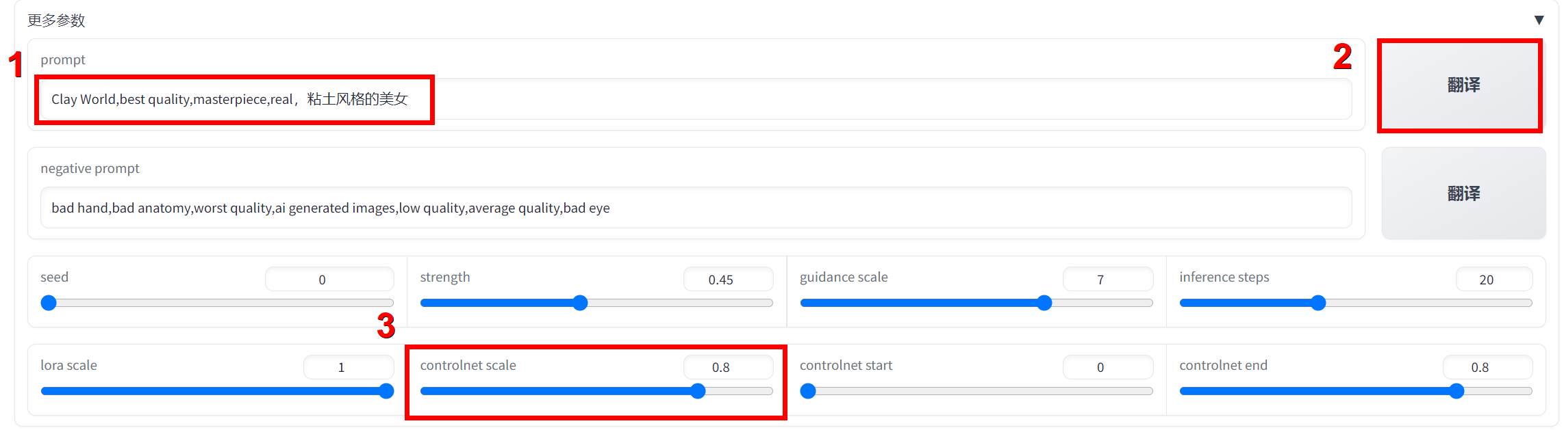 粘土风格的美女,点击翻译,得到提示词翻译结果Clay World,best quality,masterpiece,real,It's a clay-like beauty.。并调整controlnet scale值为0.8,点击生成。
